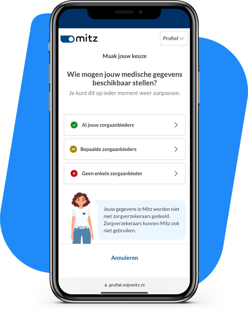 Via de online toestemmingsvoorziening Mitz kunnen patiënten zelf hun toestemmingskeuzes vastleggen en beheren. Als zorgaanbieder heeft u straks profijt van deze landelijke voorziening voor toestemmingskeuzes. U hoeft zelf geen toestemmingskeuzes meer te registreren, uw bestaande registraties worden overgezet naar Mitz én u voldoet automatisch aan alle wettelijke eisen op dit gebied. Mitz maakt voor alle zorgaanbieders en hun patiënten het beheer van toestemmingskeuzes eenvoudig en overzichtelijk.